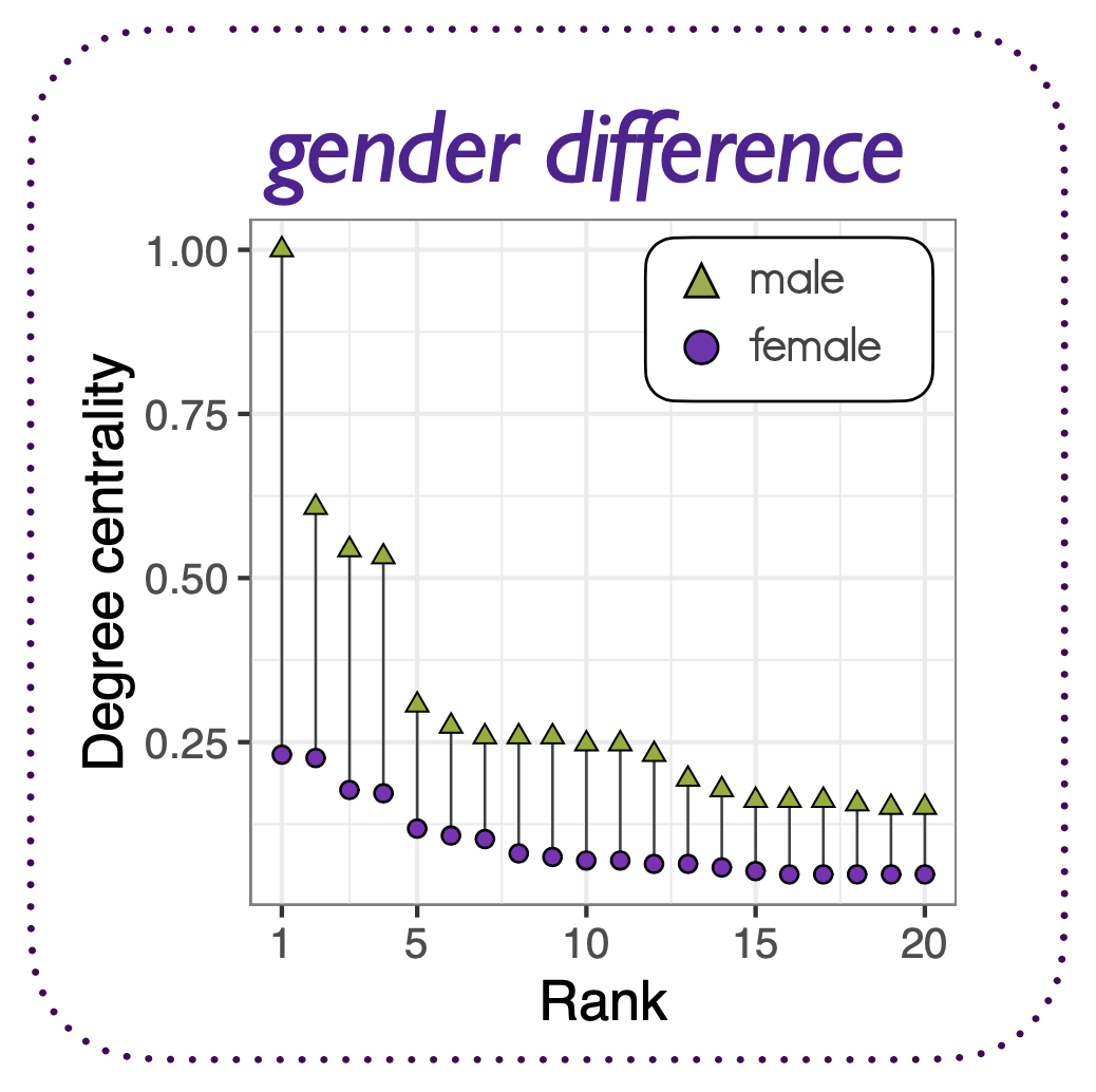 In the ballet collaboration network, each artist is represented as a node, and two nodes are connected if they are listed as collaborators of the same ballet work. The gender of the artists is inferred from names using the gender package in R.