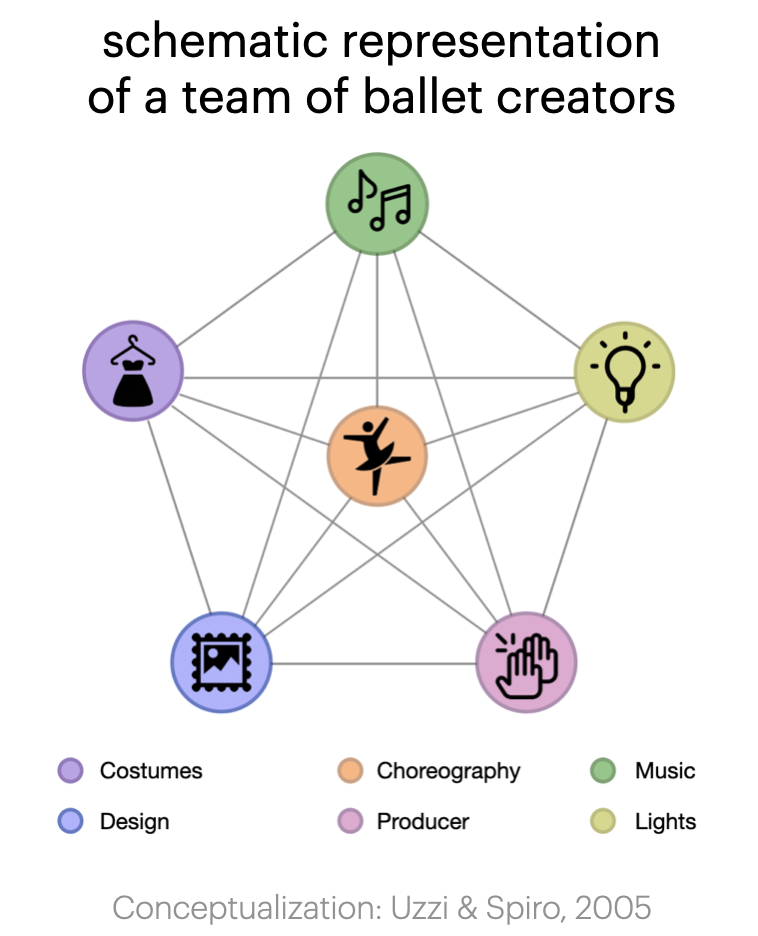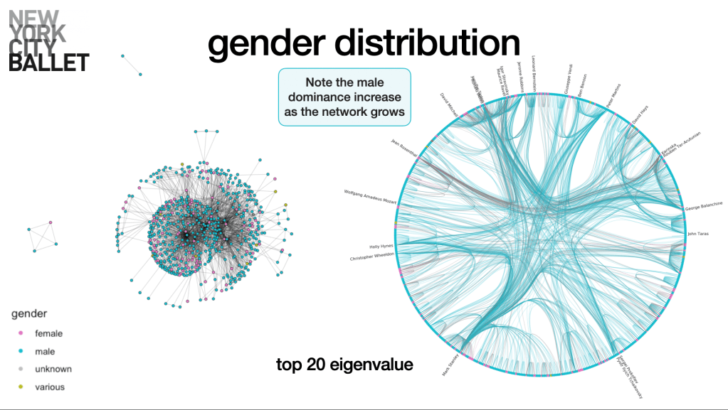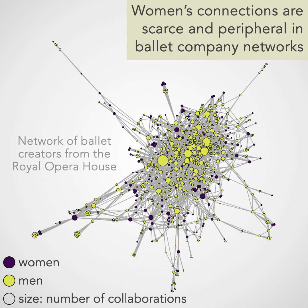 This data visualization project uses network science to illustrate the gendered collaborative patterns influencing women’s network position as creative leaders in ballet, often located at the periphery of the network rather than at the center of influence, where men are more frequently found.